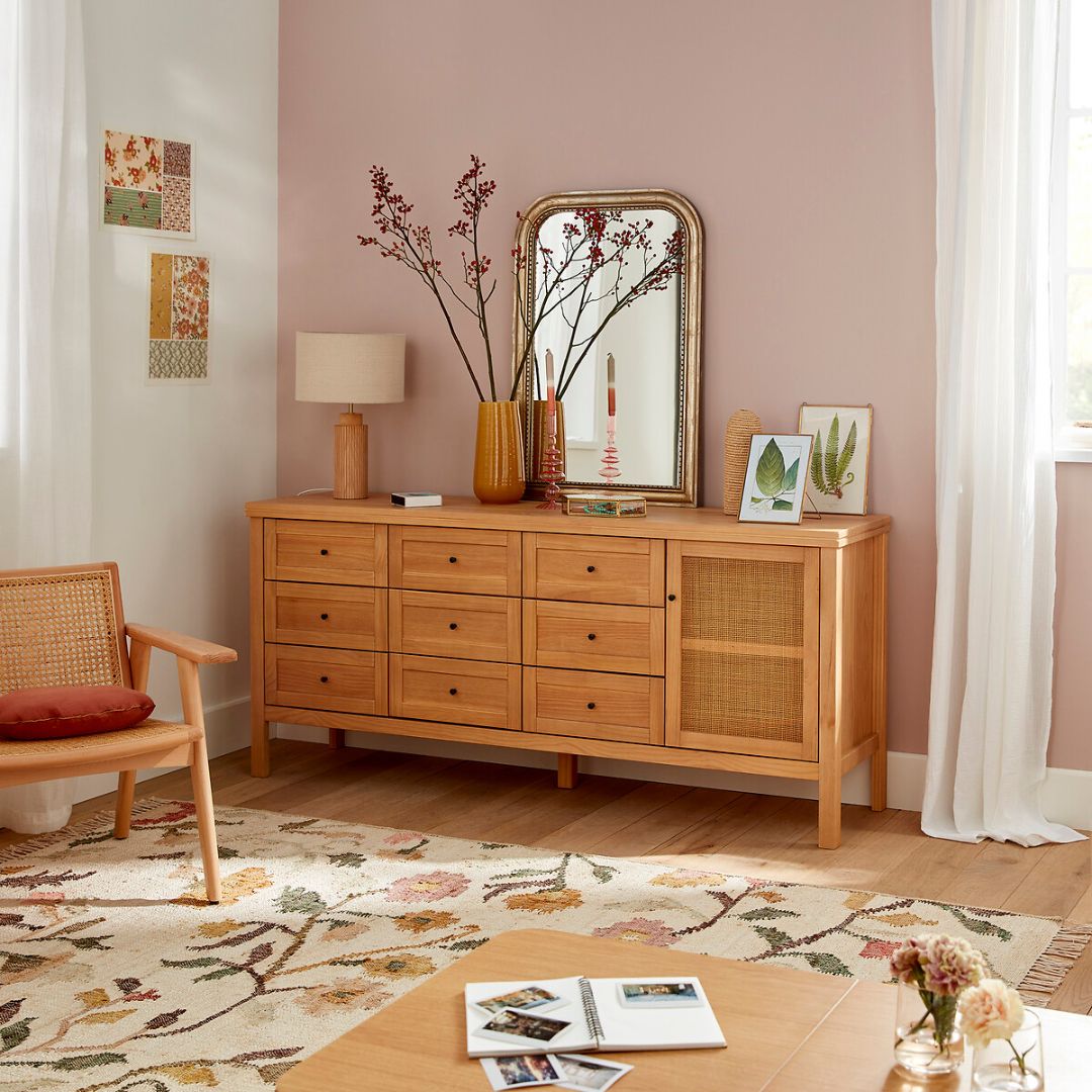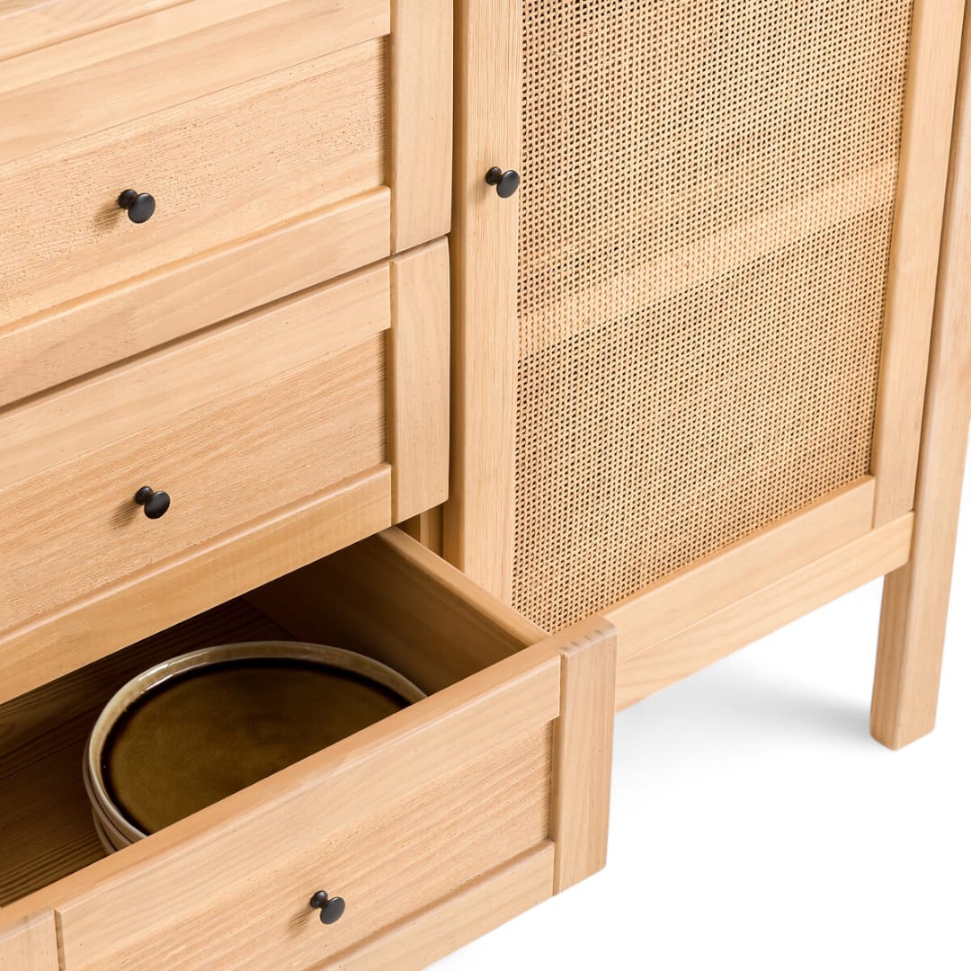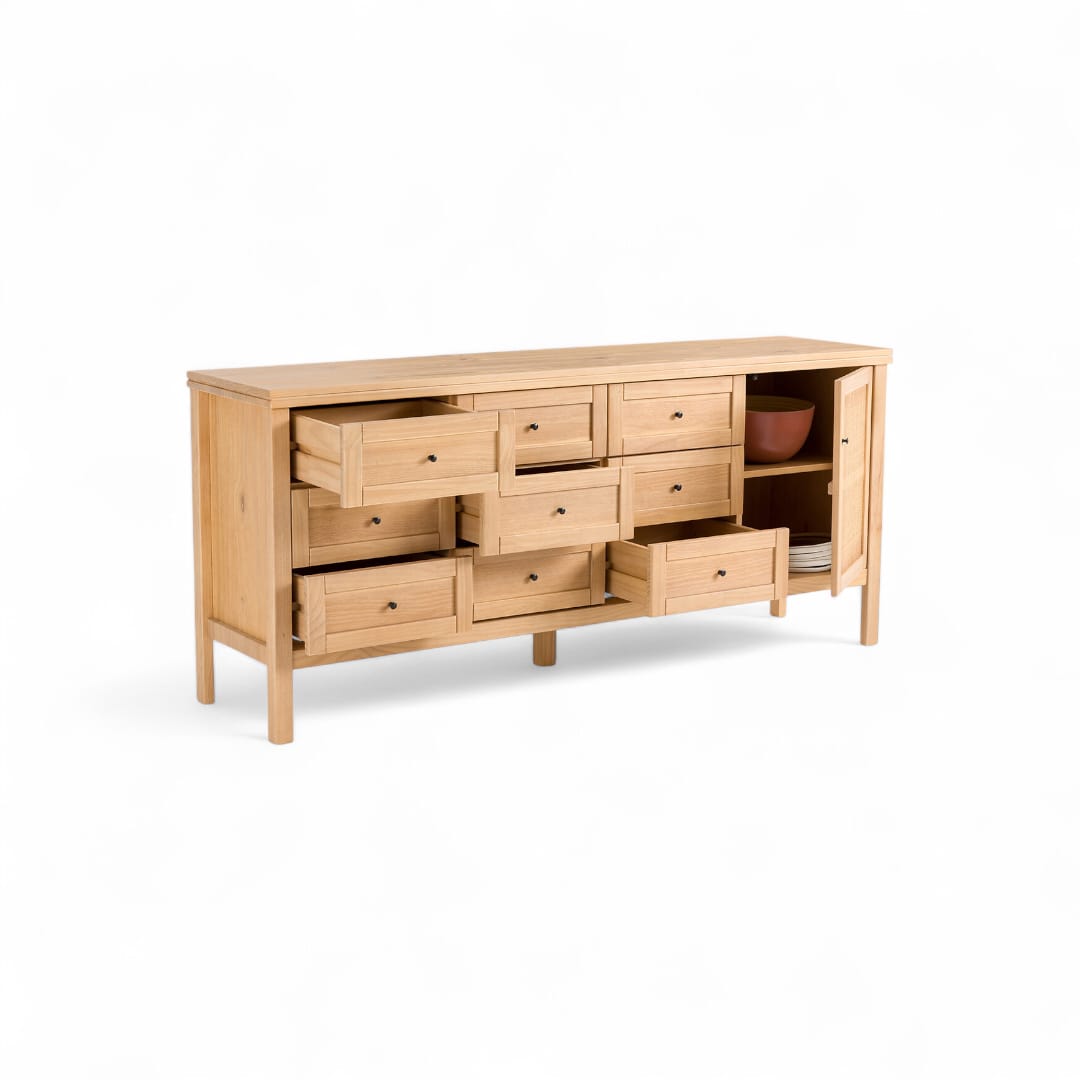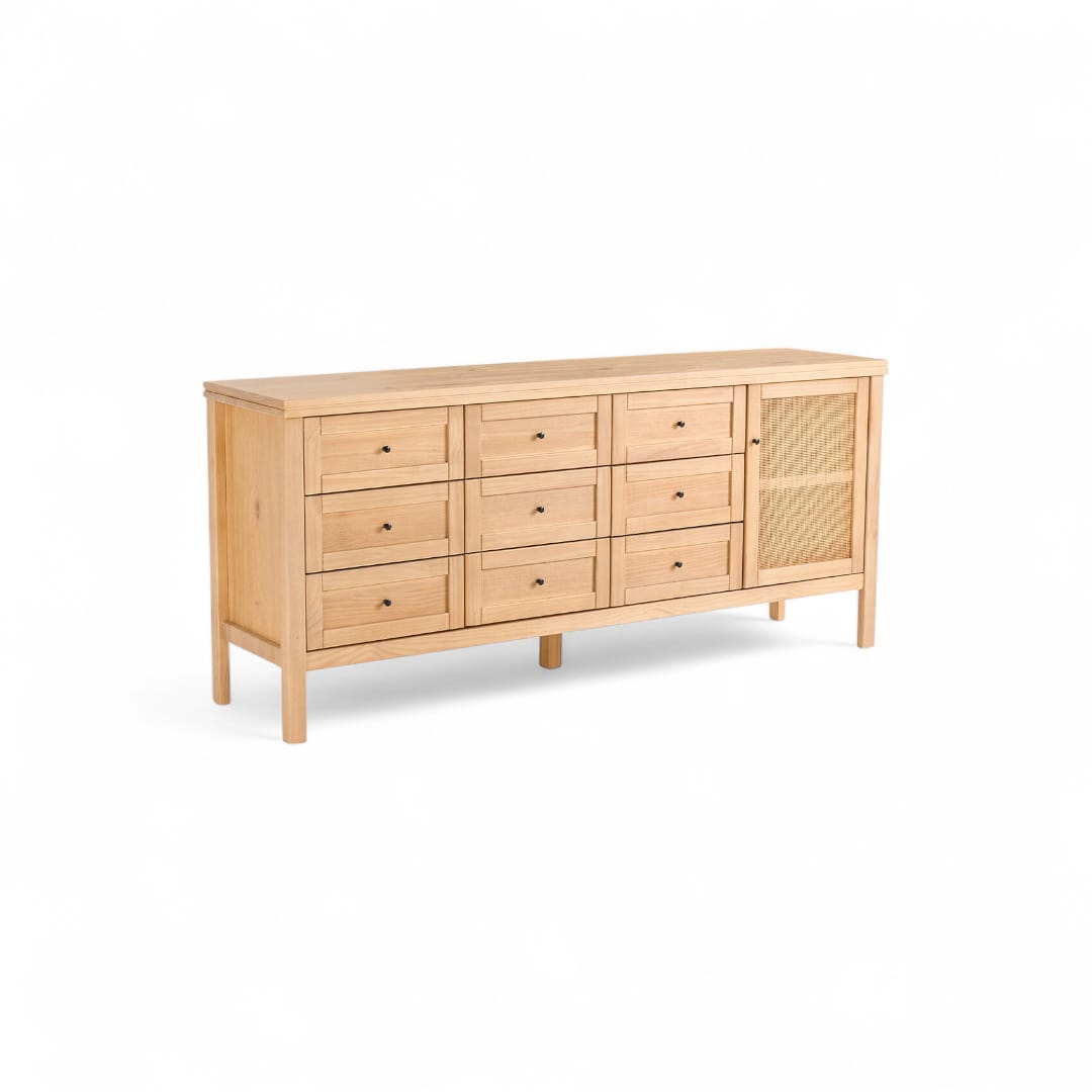Hadirkan nuansa modern dan unik di ruang tamu Anda dengan bufet kayu jati minimalis ini. Dilengkapi 9 laci penyimpanan kecil yang simetris di bagian kanan dan kiri, bufet ini memberikan ruang penyimpanan ekstra untuk barang-barang kecil. Bagian tengahnya menampilkan ruang penyimpanan utama dengan pintu kombinasi rotan, menciptakan sentuhan alami dan estetika yang menawan. Cocok untuk menambah fungsi dan gaya di rumah Anda!
