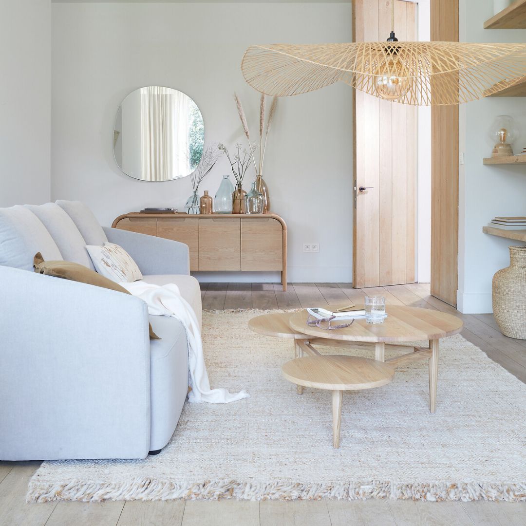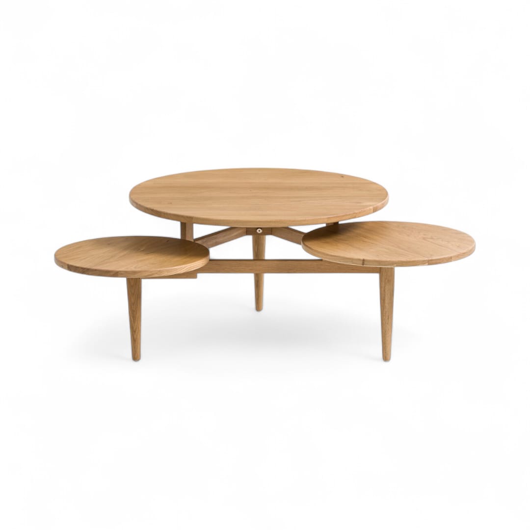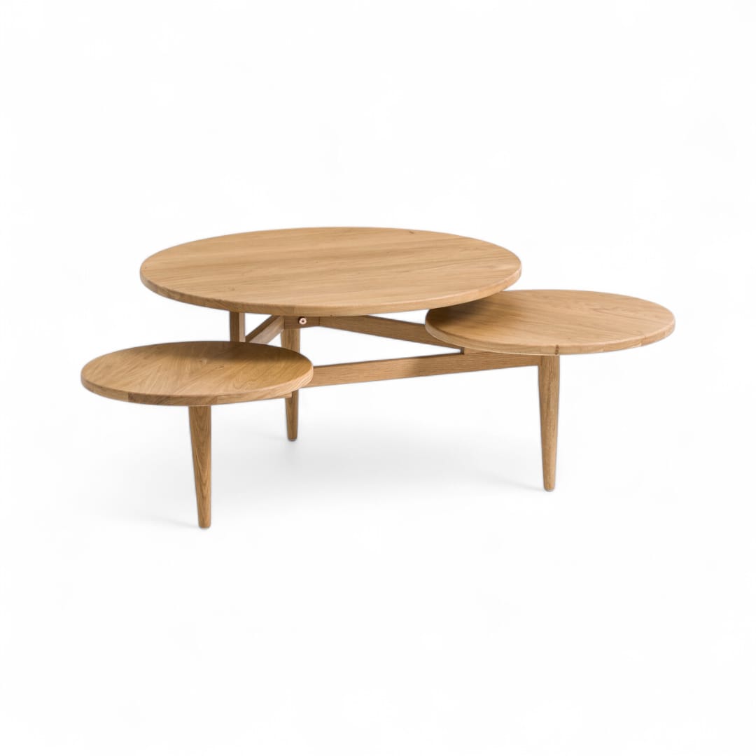 Meja ruang tamu kayu jati minimalis retro ini menghadirkan desain unik dengan bentuk persegi panjang yang dipadukan dengan top meja berupa tiga bulatan berukuran besar, sedang, dan kecil. Perpaduan elemen geometris ini menciptakan tampilan retro yang menarik dan artistik. Material kayu jati berkualitas memberikan kesan alami dan kokoh, menjadikannya pilihan sempurna untuk mempercantik ruang tamu dengan sentuhan klasik dan fungsional.