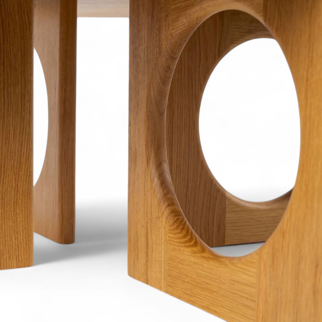 Meja ruang tamu kayu jati minimalis modern ini hadir dengan top meja berbentuk bulat yang elegan, didukung oleh empat kaki berbentuk persegi dengan detail variasi bulat yang unik di bagian kaki. Perpaduan desain ini menciptakan kesan modern yang berkarakter, sekaligus menjaga kestabilan meja. Terbuat dari kayu jati berkualitas tinggi, meja ini menawarkan ketahanan dan keindahan alami, menjadikannya pilihan ideal untuk mempercantik ruang tamu dengan sentuhan yang fungsional dan estetis.