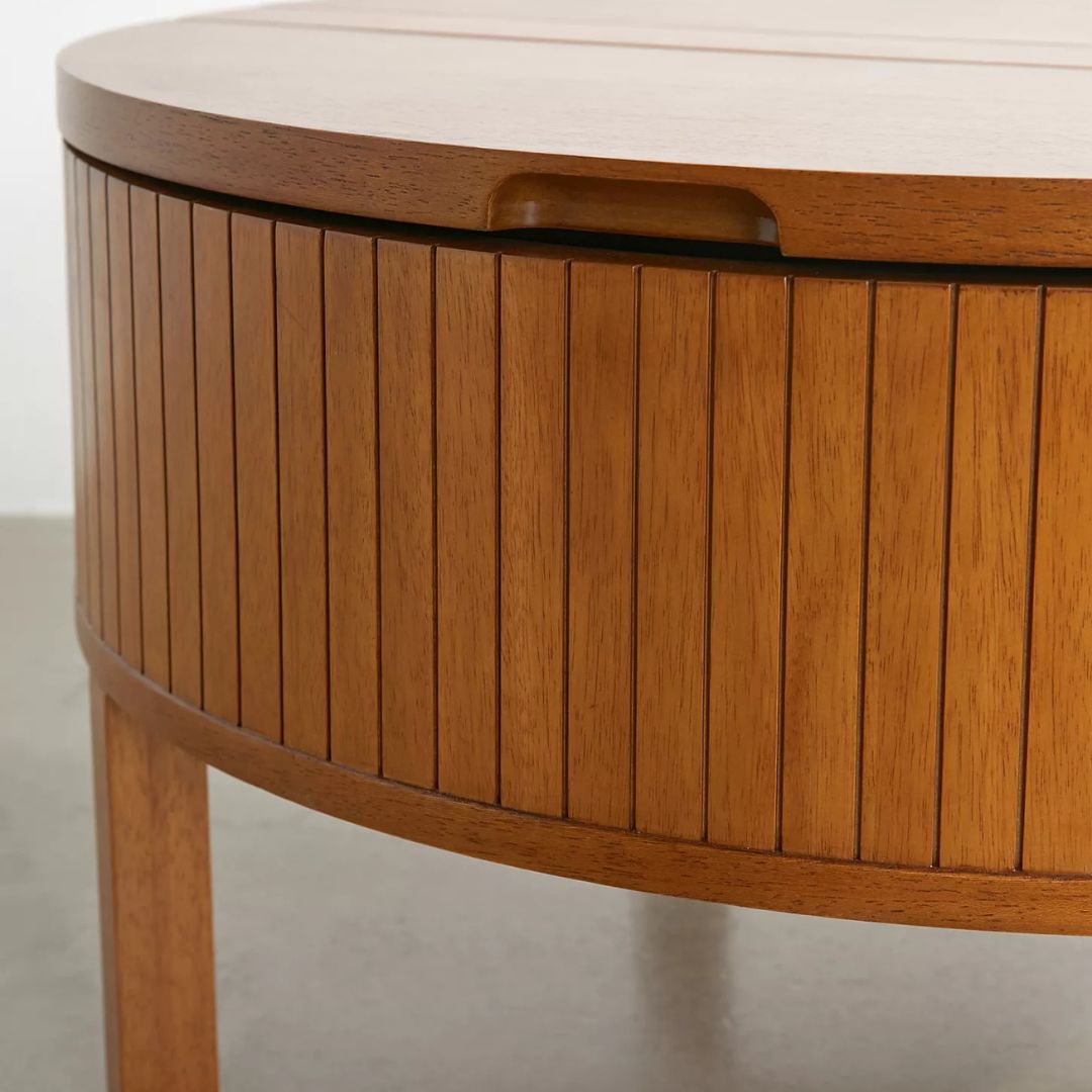 Meja ruang tamu kayu jati minimalis retro dengan bentuk bulat berdiameter 75 cm ini memadukan estetika dan fungsi. Top meja yang dapat dibuka dan ditutup menghadirkan ruang penyimpanan tersembunyi, ideal untuk menjaga kerapian ruang tamu Anda. Terbuat dari kayu jati berkualitas, meja ini menampilkan keindahan alami dengan sentuhan retro yang hangat, menjadikannya elemen dekoratif sekaligus praktis dalam interior Anda.