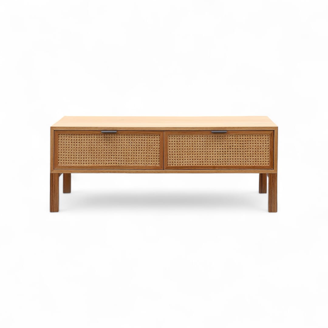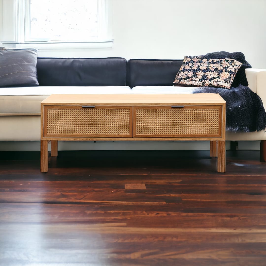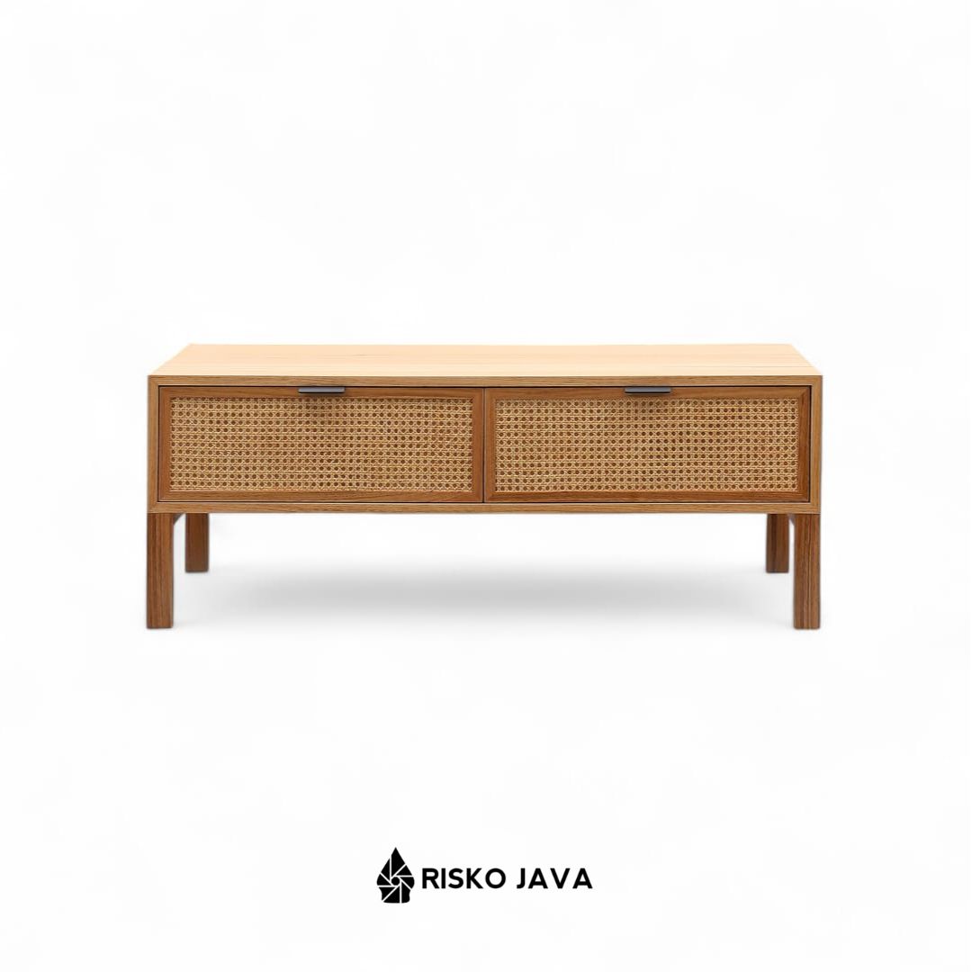 Meja ruang tamu kayu jati minimalis modern ini menampilkan desain persegi panjang yang elegan, lengkap dengan dua laci penyimpanan yang menggunakan kombinasi rotan. Laci rotan memberikan sentuhan tekstur yang unik dan memikat, menambah keindahan visual sambil menawarkan fungsionalitas. Terbuat dari kayu jati berkualitas tinggi, meja ini memadukan kehangatan alami dengan desain modern, menciptakan ruang tamu yang stylish dan terorganisir.