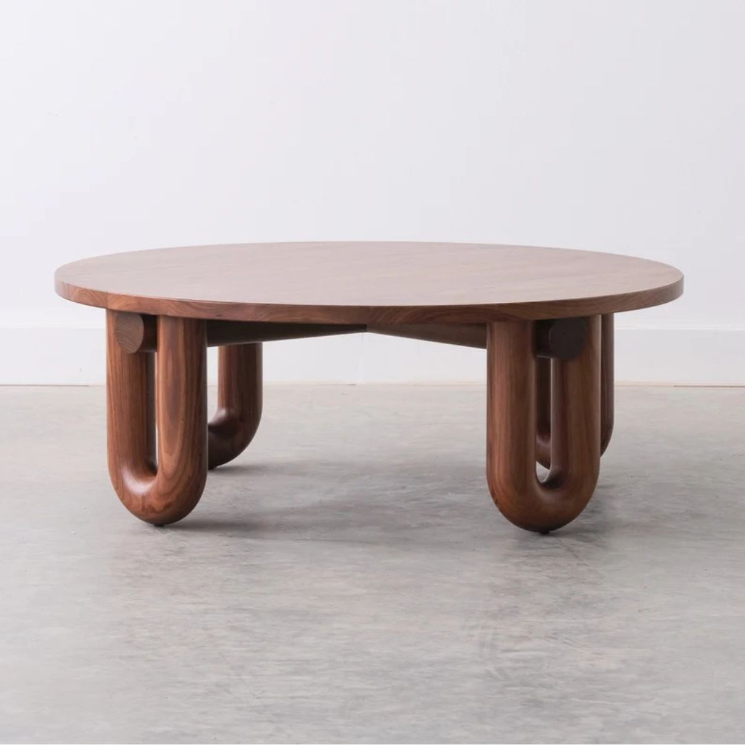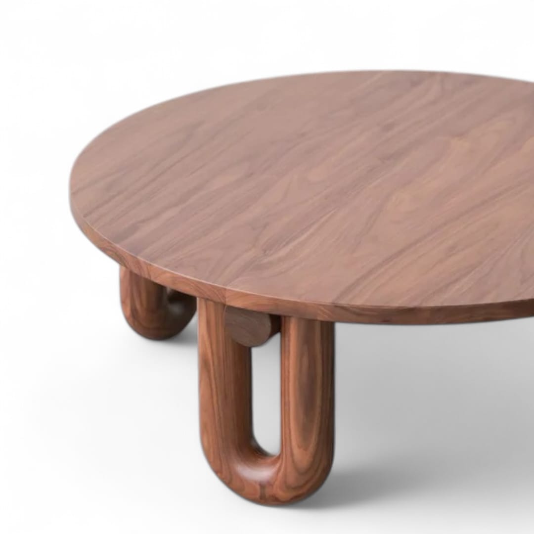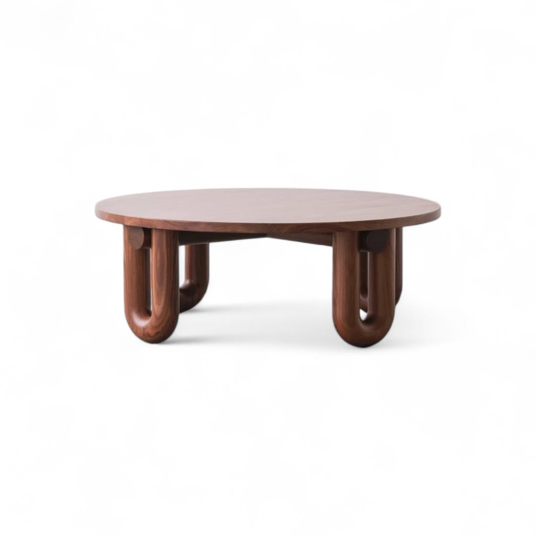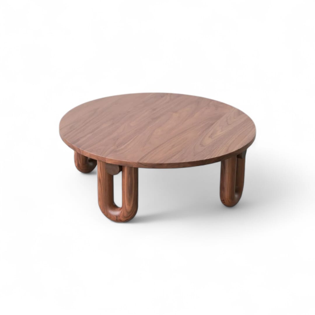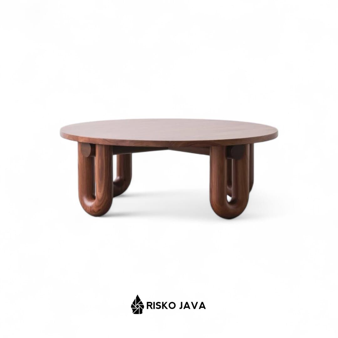 Coffee table kayu jati minimalis modern dengan desain bulat dan 4 kaki U yang stabil. Cocok untuk meja ruang tamu, tempat dekorasi, dan meja santai keluarga. Dibuat dari kayu jati Perhutani pilihan, finishing custom, tahan lama, dan ready stock.