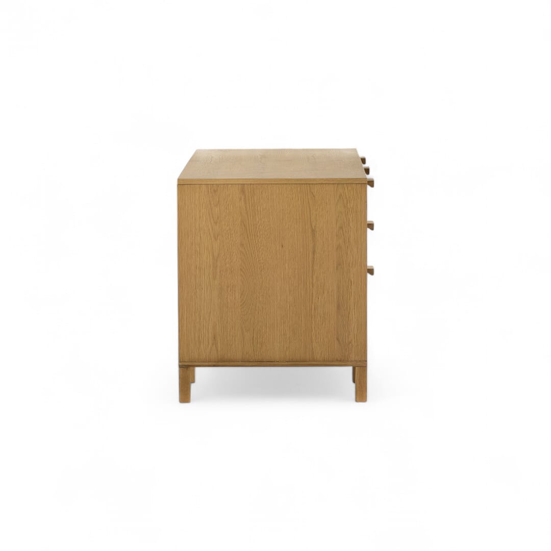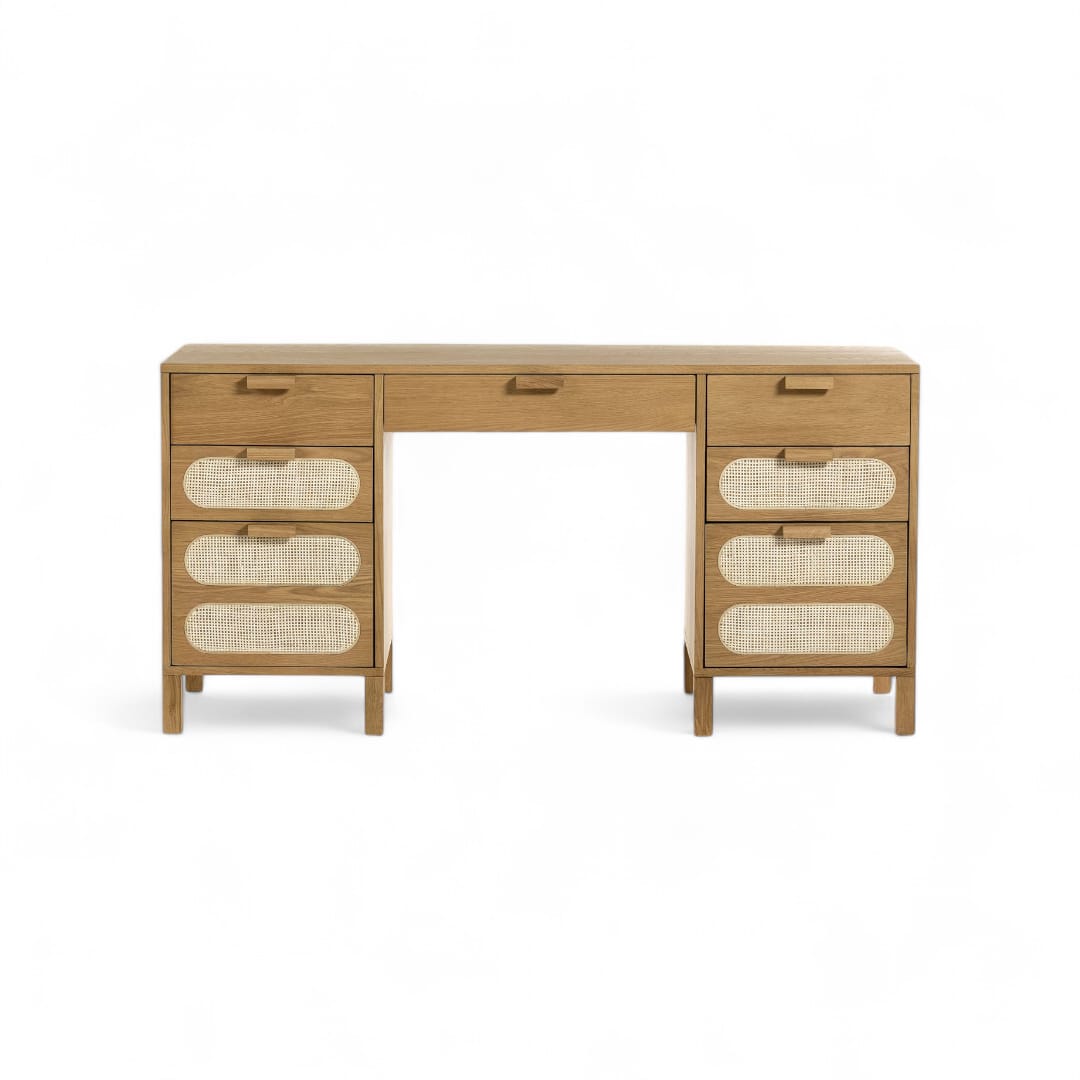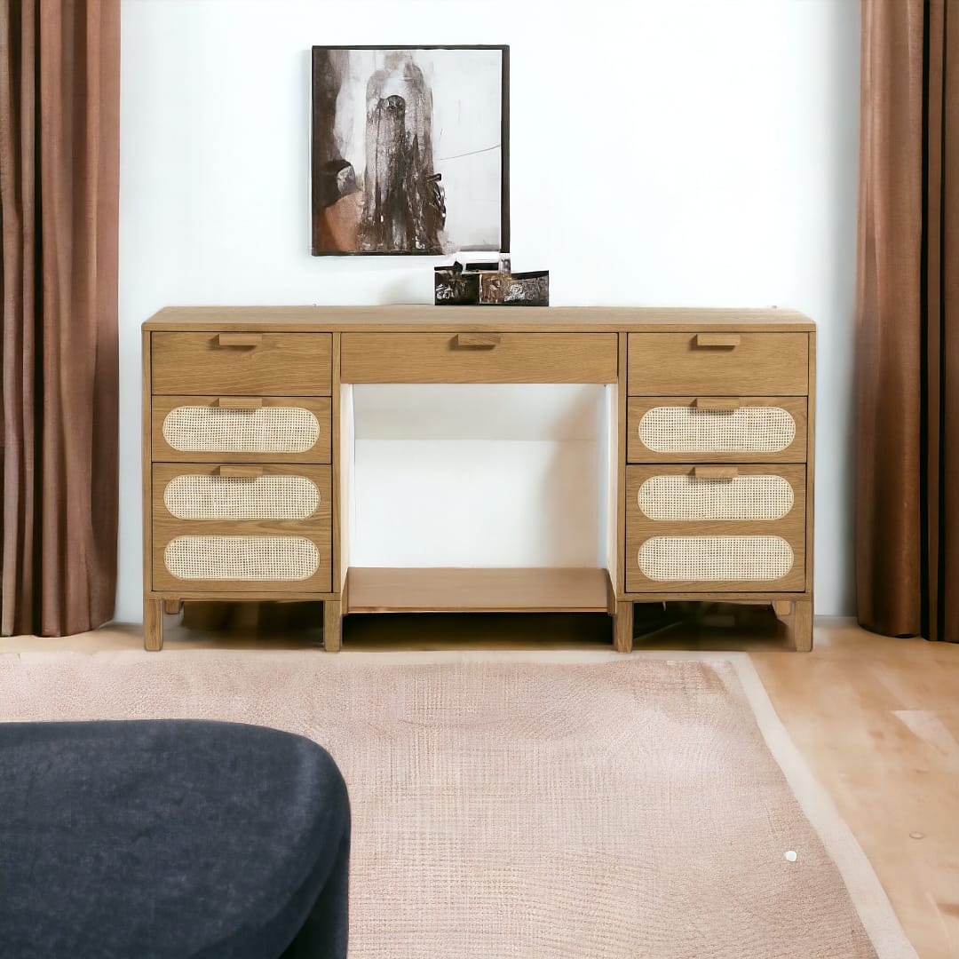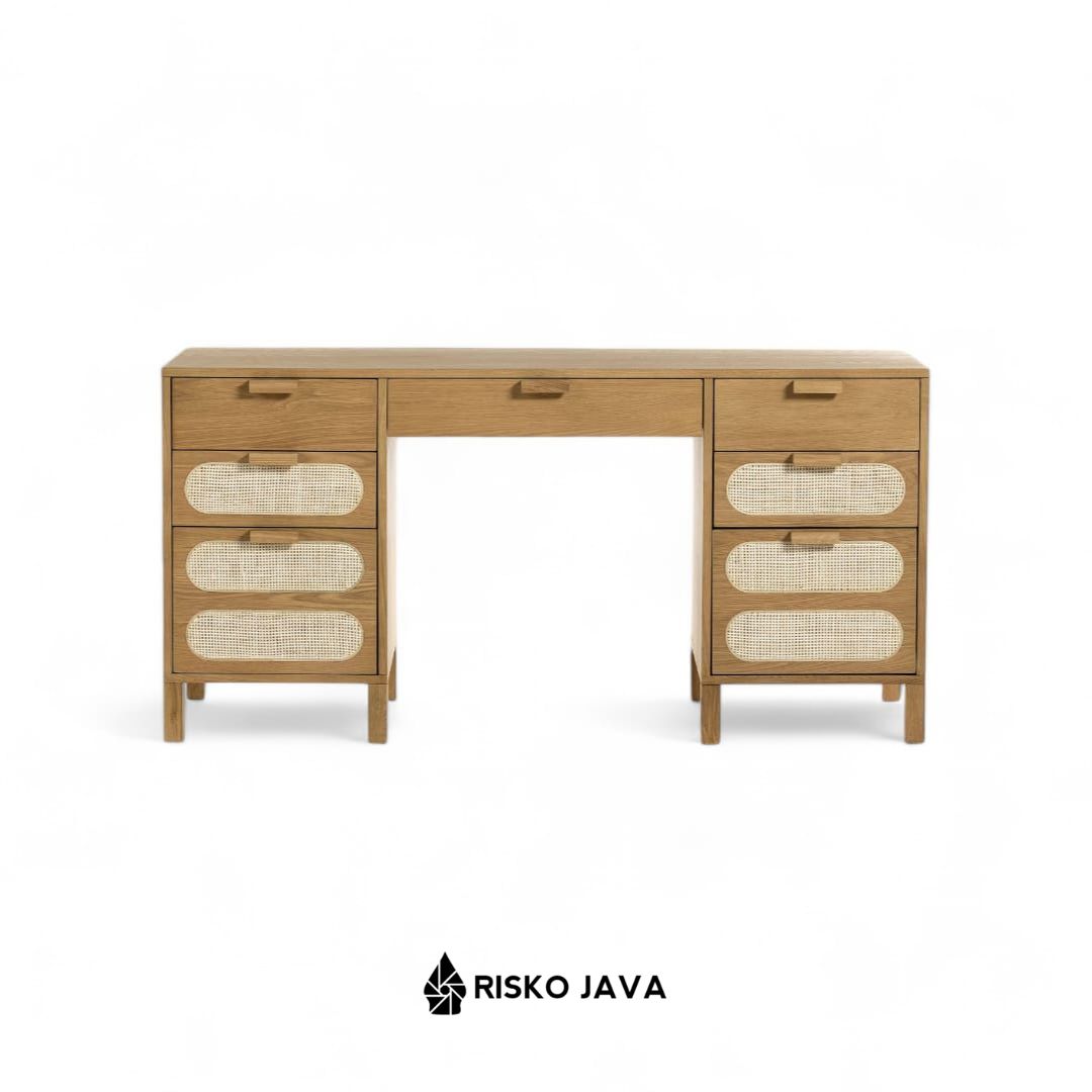 Meja ini dirancang dengan bentuk persegi panjang modern dan sentuhan rotan pada bagian laci. Perpaduan kayu jati solid dan rotan memberikan nuansa hangat dan natural, sehingga ruang Anda terlihat lebih elegan dan menenangkan.