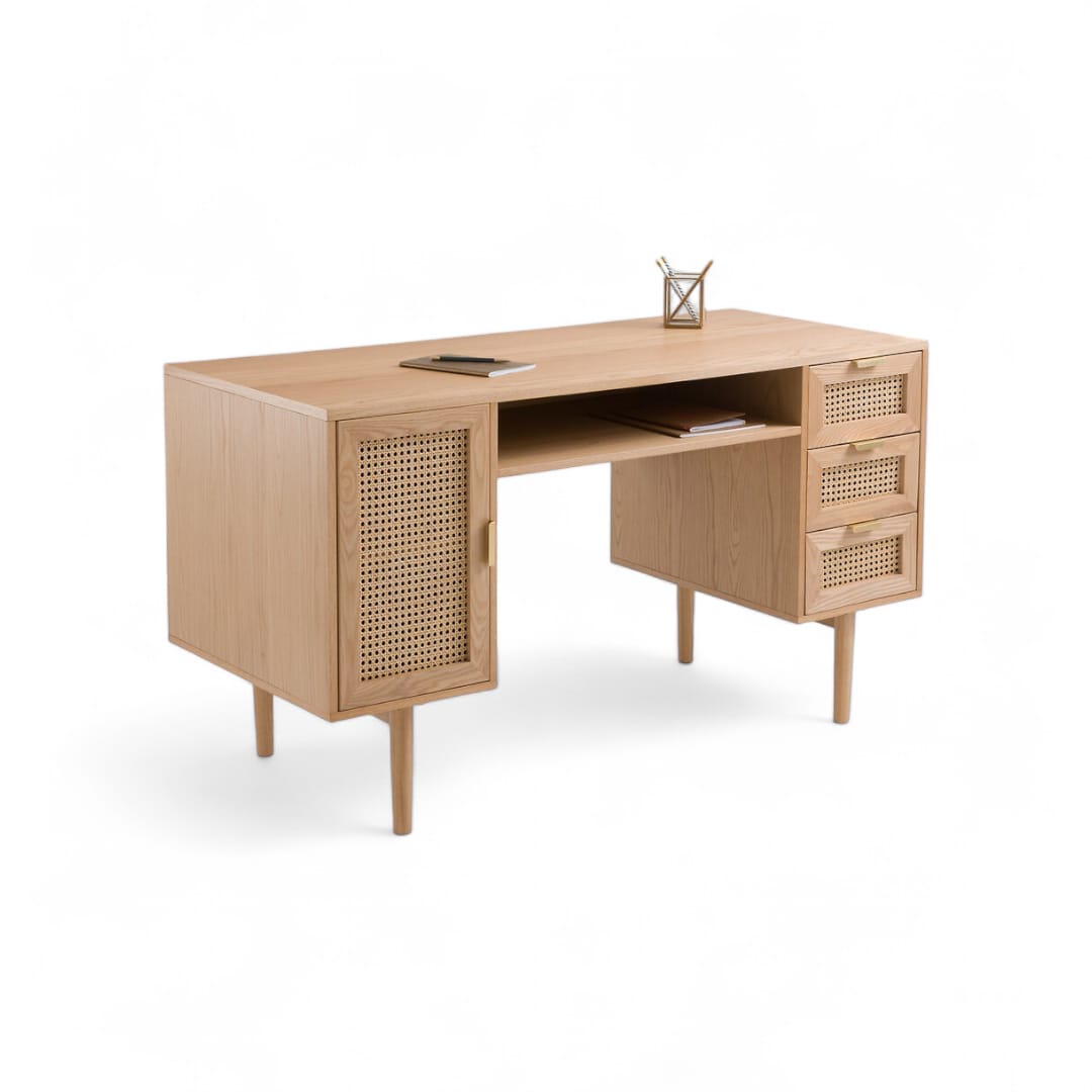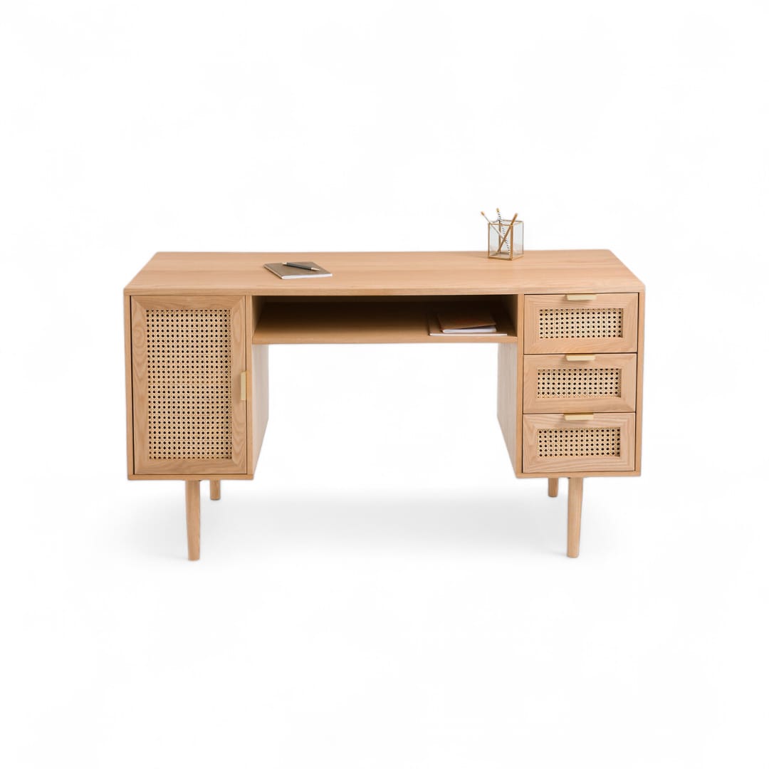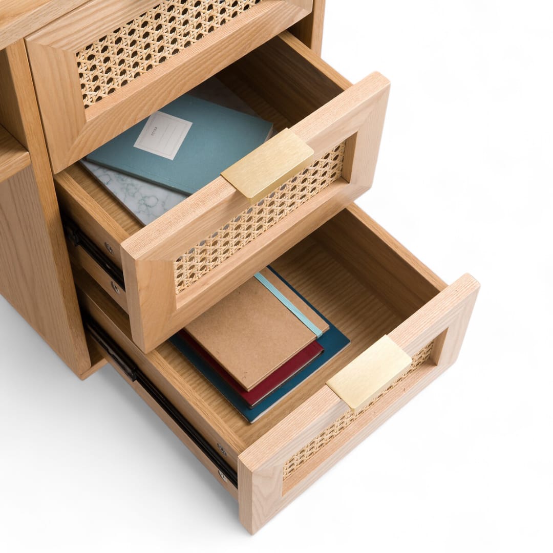 Selain itu, meja ini dilengkapi dengan 3 laci di bagian kanan, ruang penyimpanan kombinasi rotan di sisi kiri, serta rak terbuka di bagian tengah. Dengan begitu, Anda bisa menyimpan dokumen, buku, hingga perlengkapan kerja dengan lebih praktis 📚🖋️.