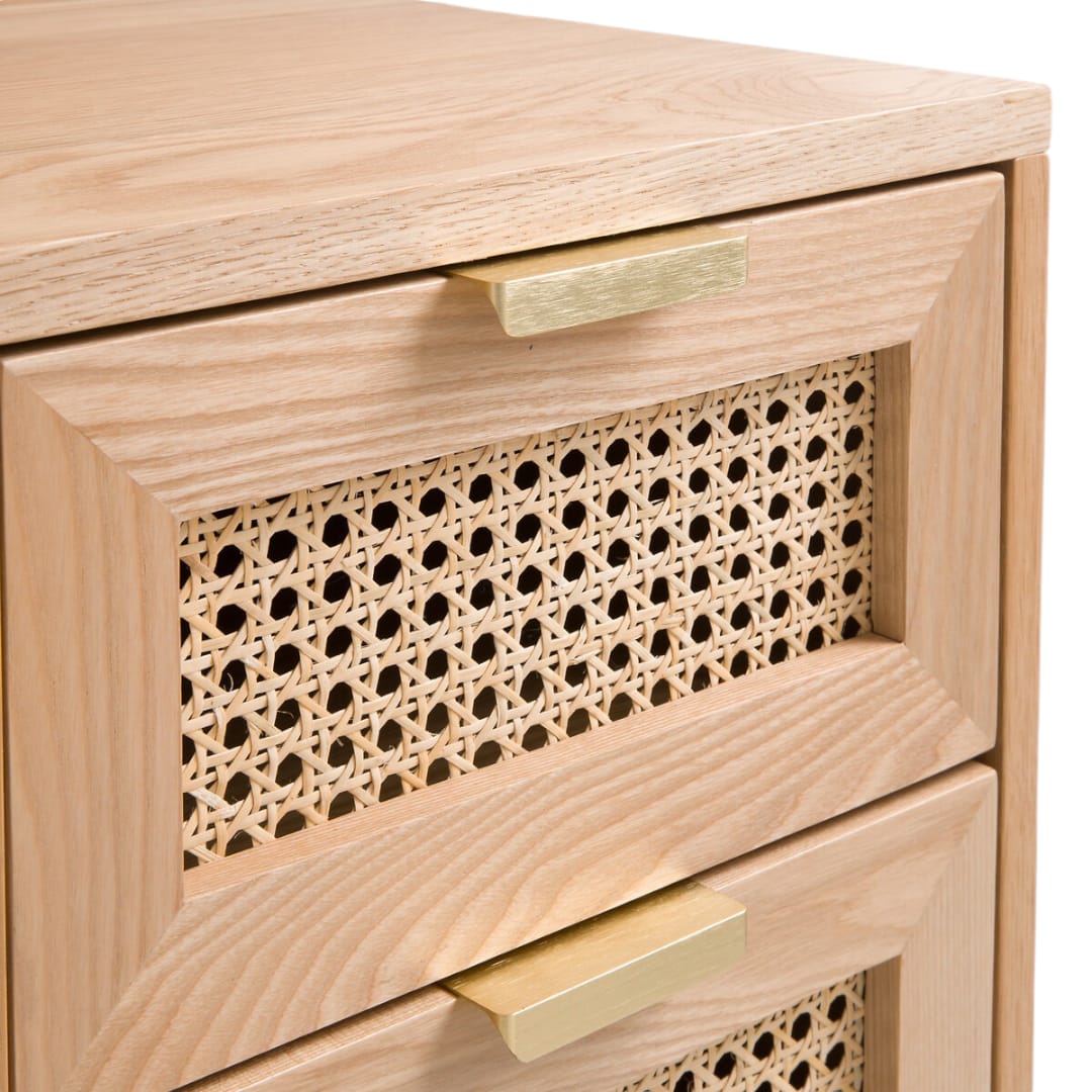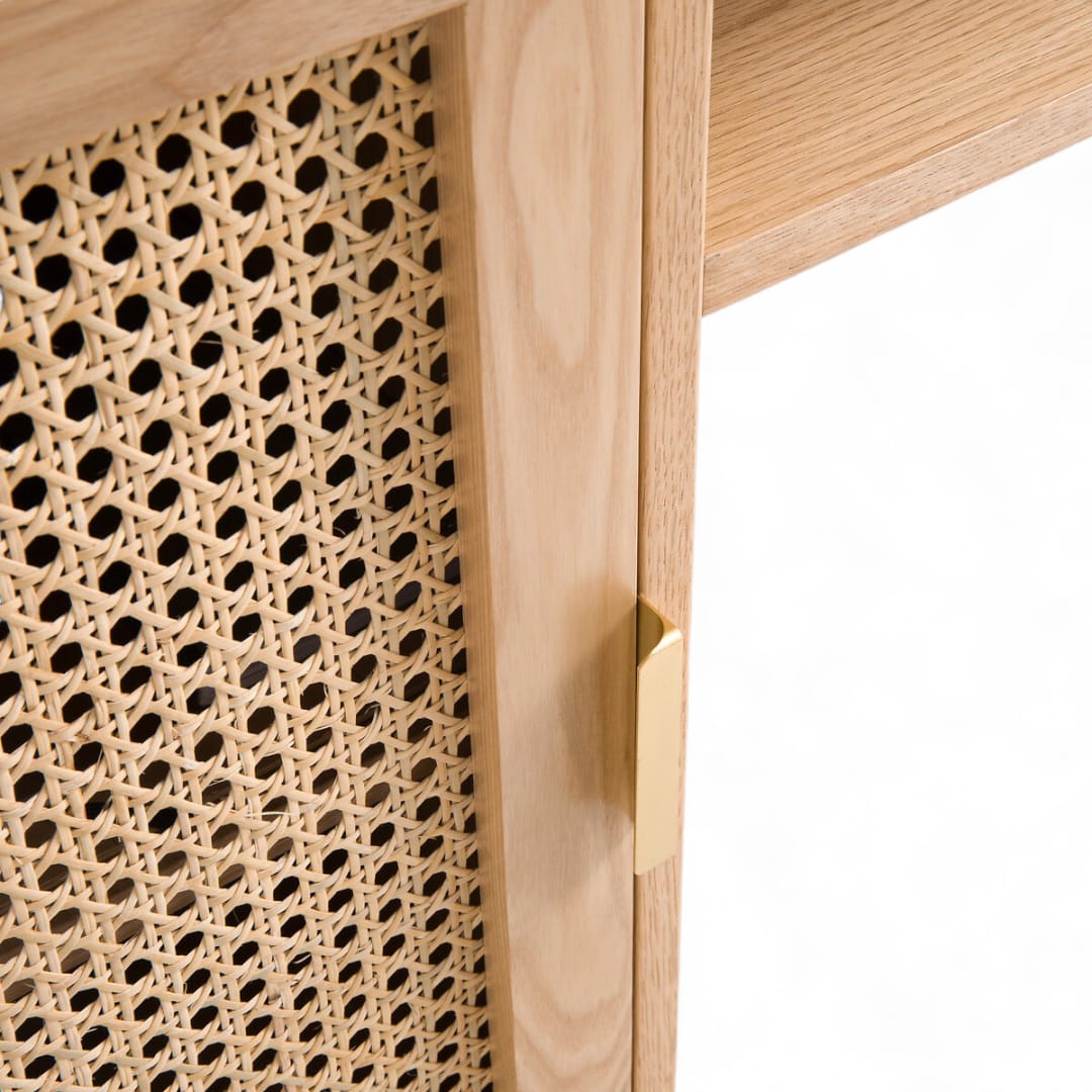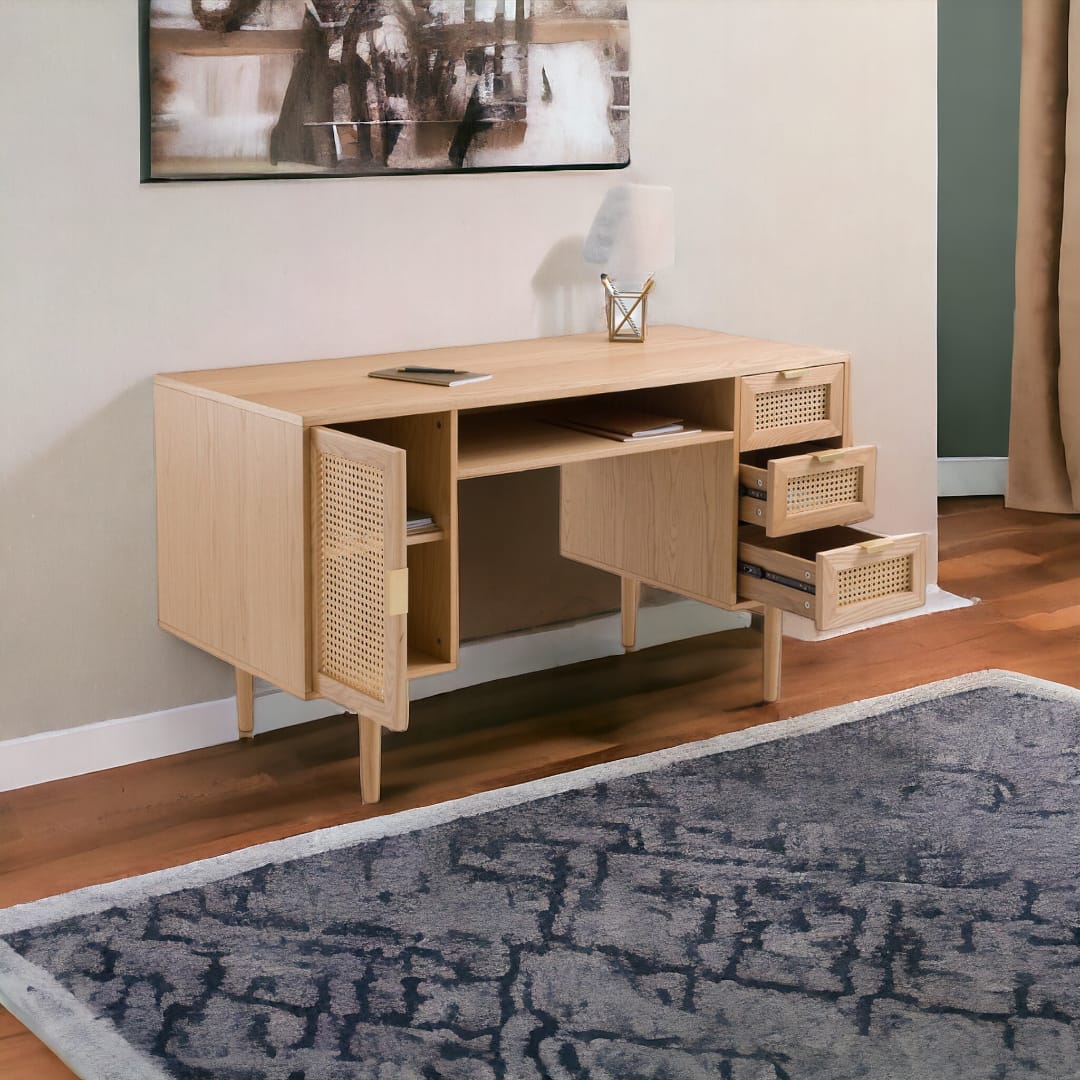 Selain itu, meja ini dilengkapi dengan 3 laci di bagian kanan, ruang penyimpanan kombinasi rotan di sisi kiri, serta rak terbuka di bagian tengah. Dengan begitu, Anda bisa menyimpan dokumen, buku, hingga perlengkapan kerja dengan lebih praktis 📚🖋️.