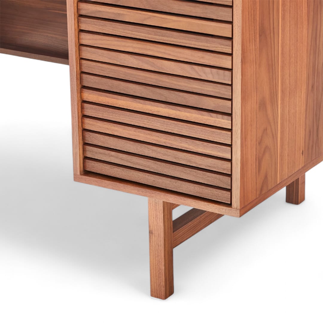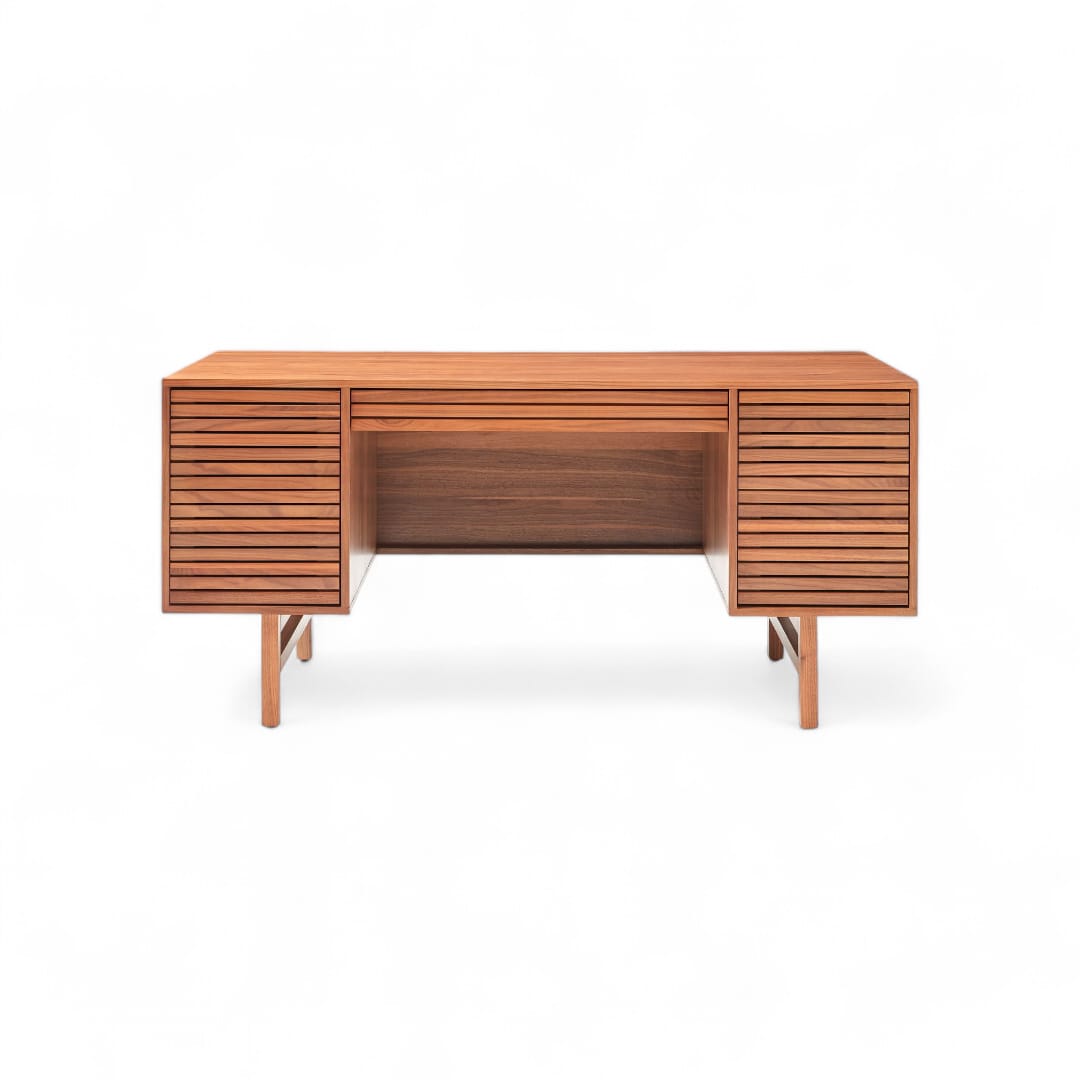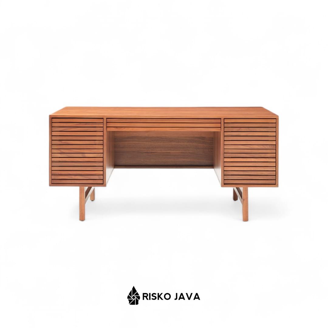 Selain itu, meja ini dilengkapi dengan dua ruang penyimpanan di sisi kanan dan kiri, serta laci tengah bermotif garis yang menambah sentuhan estetik. Karena terbuat dari kayu jati berkualitas, meja ini tidak hanya kuat, tetapi juga tahan lama sehingga menjadi investasi terbaik untuk ruang kerja Anda.