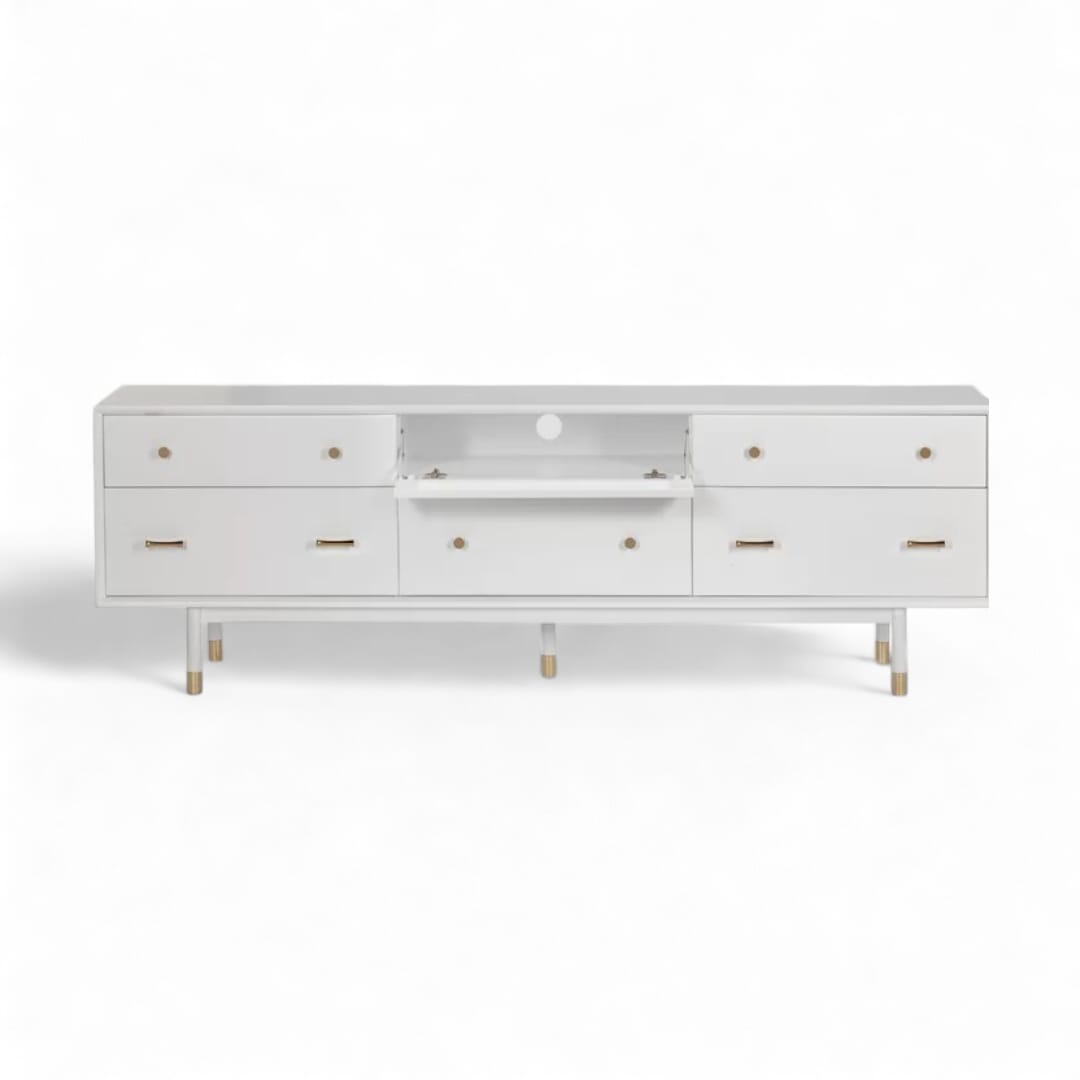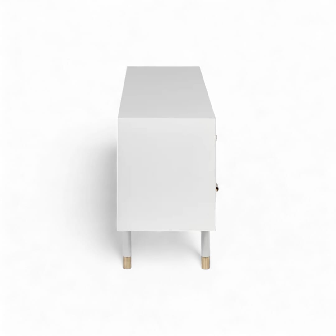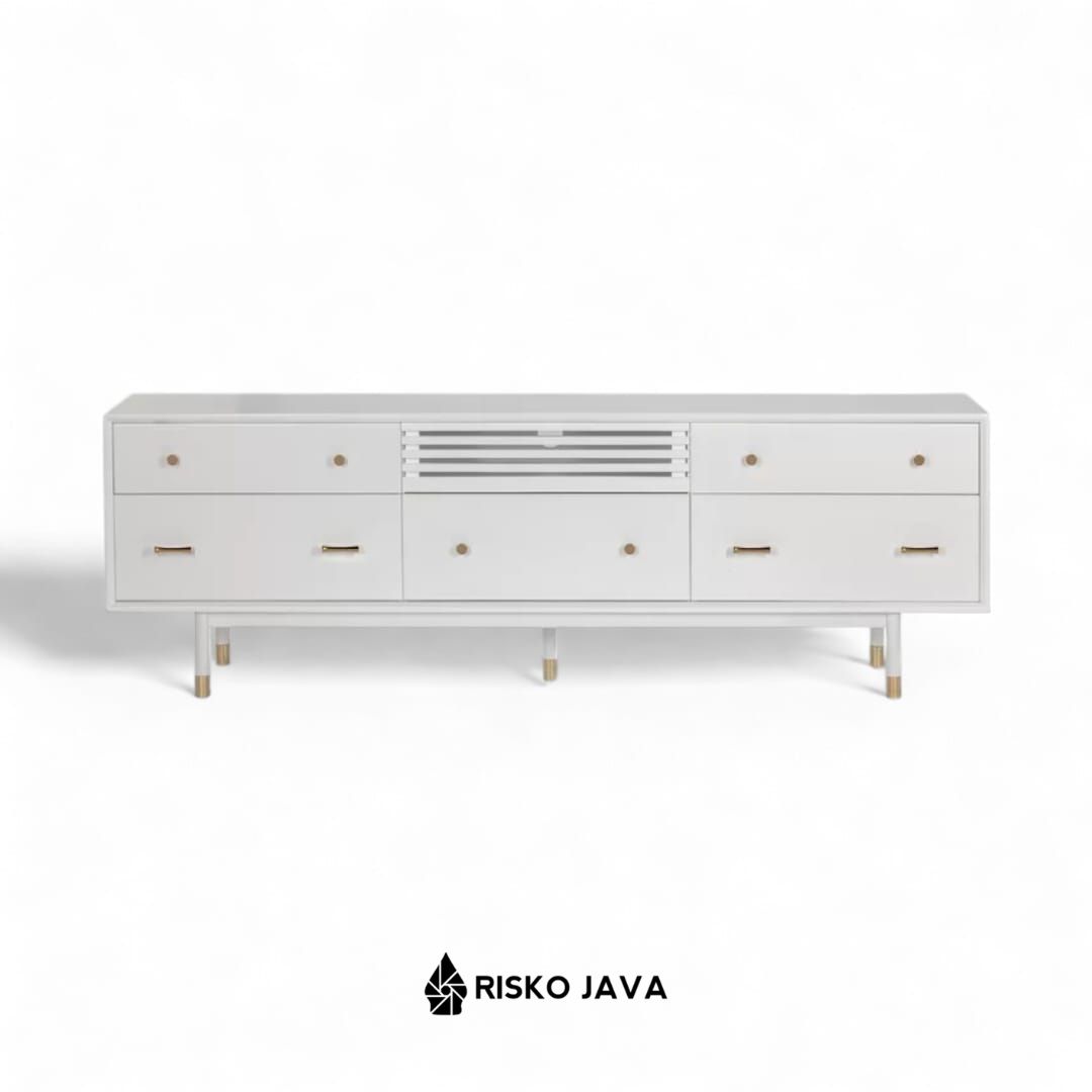 Tingkatkan estetika ruang tamu Anda dengan meja TV kayu jati minimalis modern ini. Dilengkapi dengan laci penyimpanan dan ruang penyimpanan tambahan, desainnya memadukan fungsionalitas dengan keindahan. Finishing Duco putih memberikan sentuhan bersih dan elegan, menonjolkan keindahan alami kayu jati dan menambah keanggunan ruang tamu Anda. Sempurna untuk menciptakan tampilan yang stylish dan terorganisir.