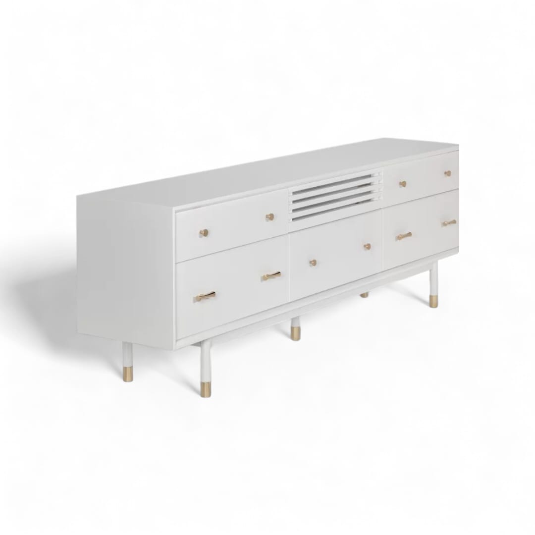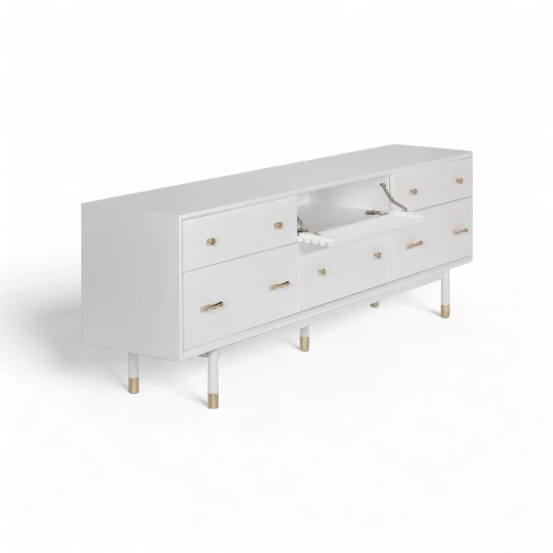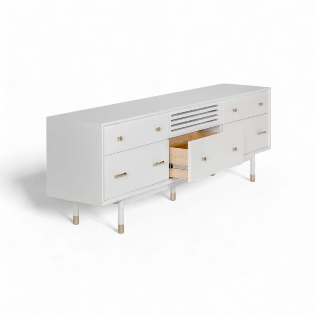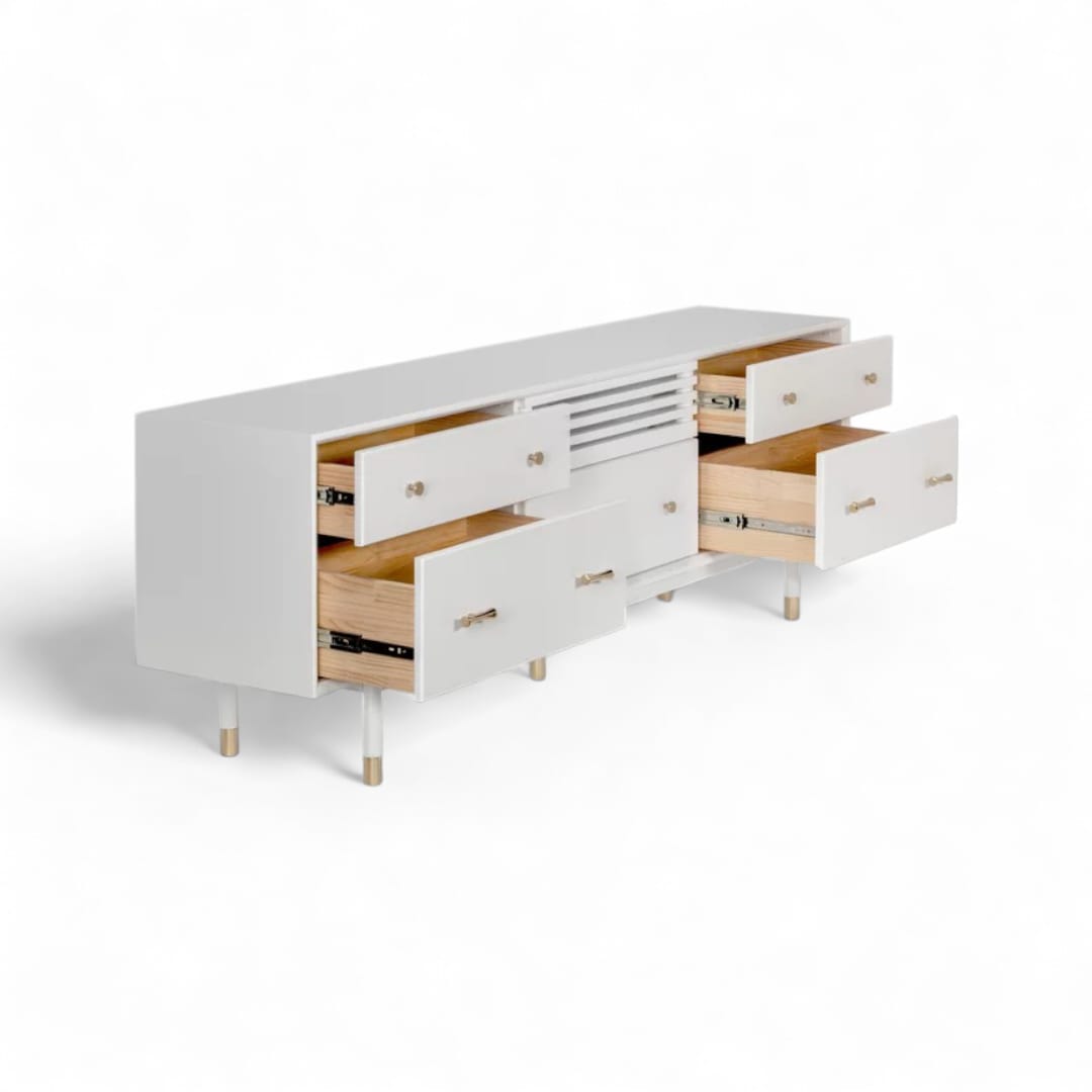 Tingkatkan estetika ruang tamu Anda dengan meja TV kayu jati minimalis modern ini. Dilengkapi dengan laci penyimpanan dan ruang penyimpanan tambahan, desainnya memadukan fungsionalitas dengan keindahan. Finishing Duco putih memberikan sentuhan bersih dan elegan, menonjolkan keindahan alami kayu jati dan menambah keanggunan ruang tamu Anda. Sempurna untuk menciptakan tampilan yang stylish dan terorganisir.