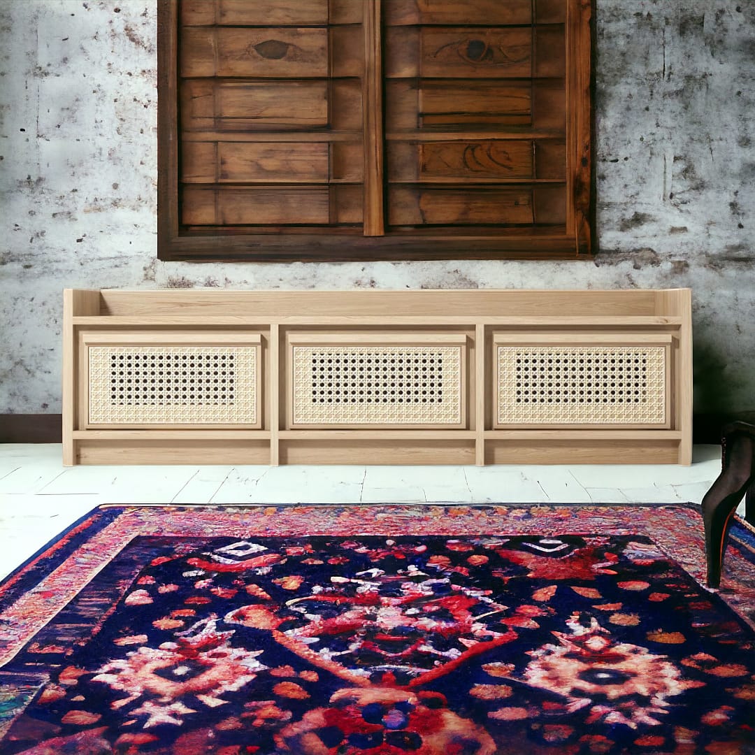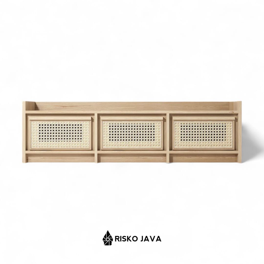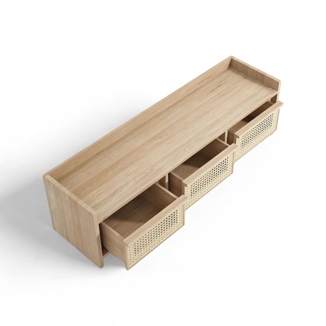 Tingkatkan tampilan ruang tamu Anda dengan meja TV kayu jati minimalis modern ini. Didesain dengan tiga laci penyimpanan yang stylish dan kombinasi rotan yang menambah sentuhan tekstural yang menarik. Meja ini memadukan keindahan kayu jati dengan elemen rotan, menciptakan keseimbangan antara fungsionalitas dan estetika modern. Sempurna untuk menambah karakter dan keteraturan di ruang tamu Anda.