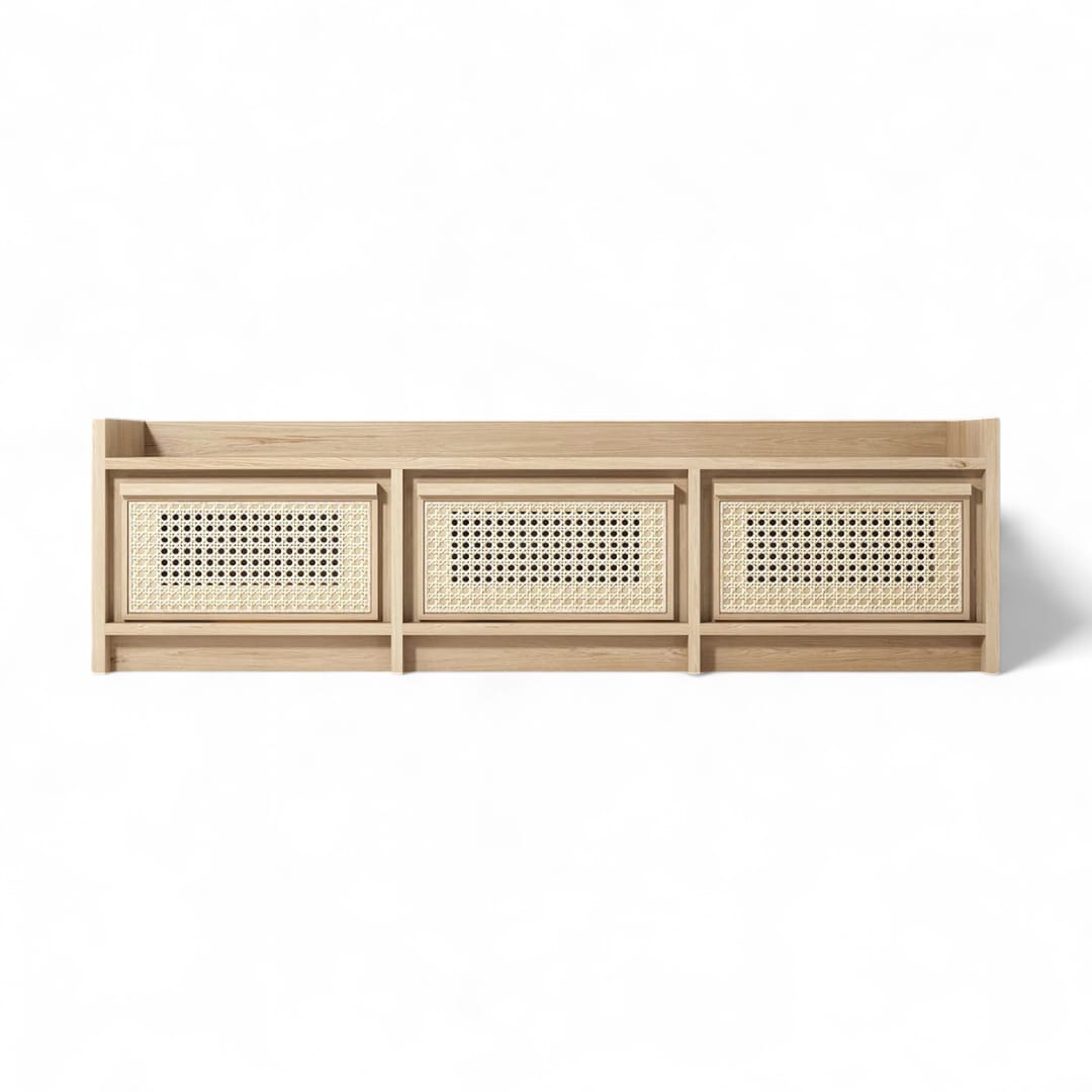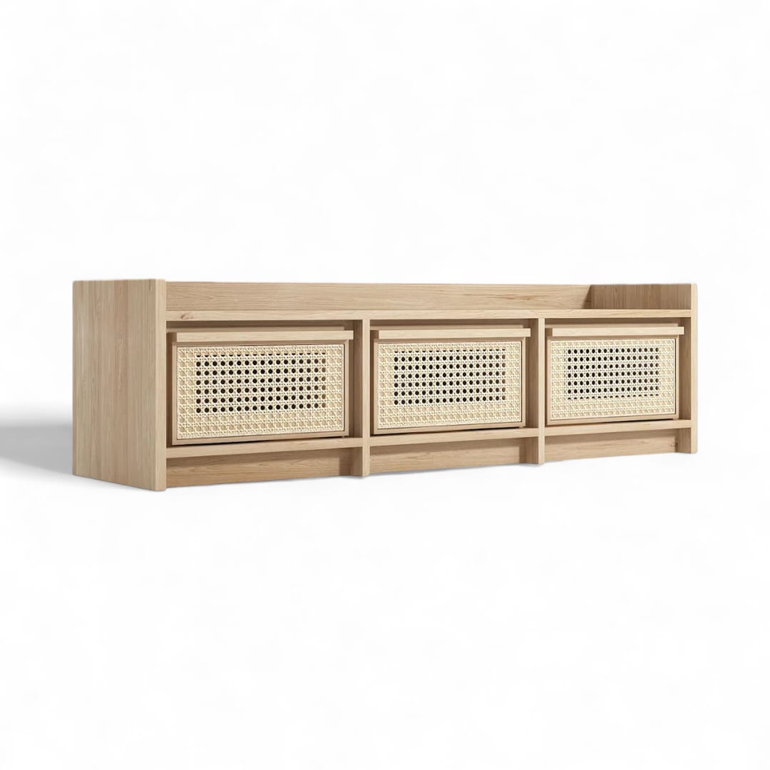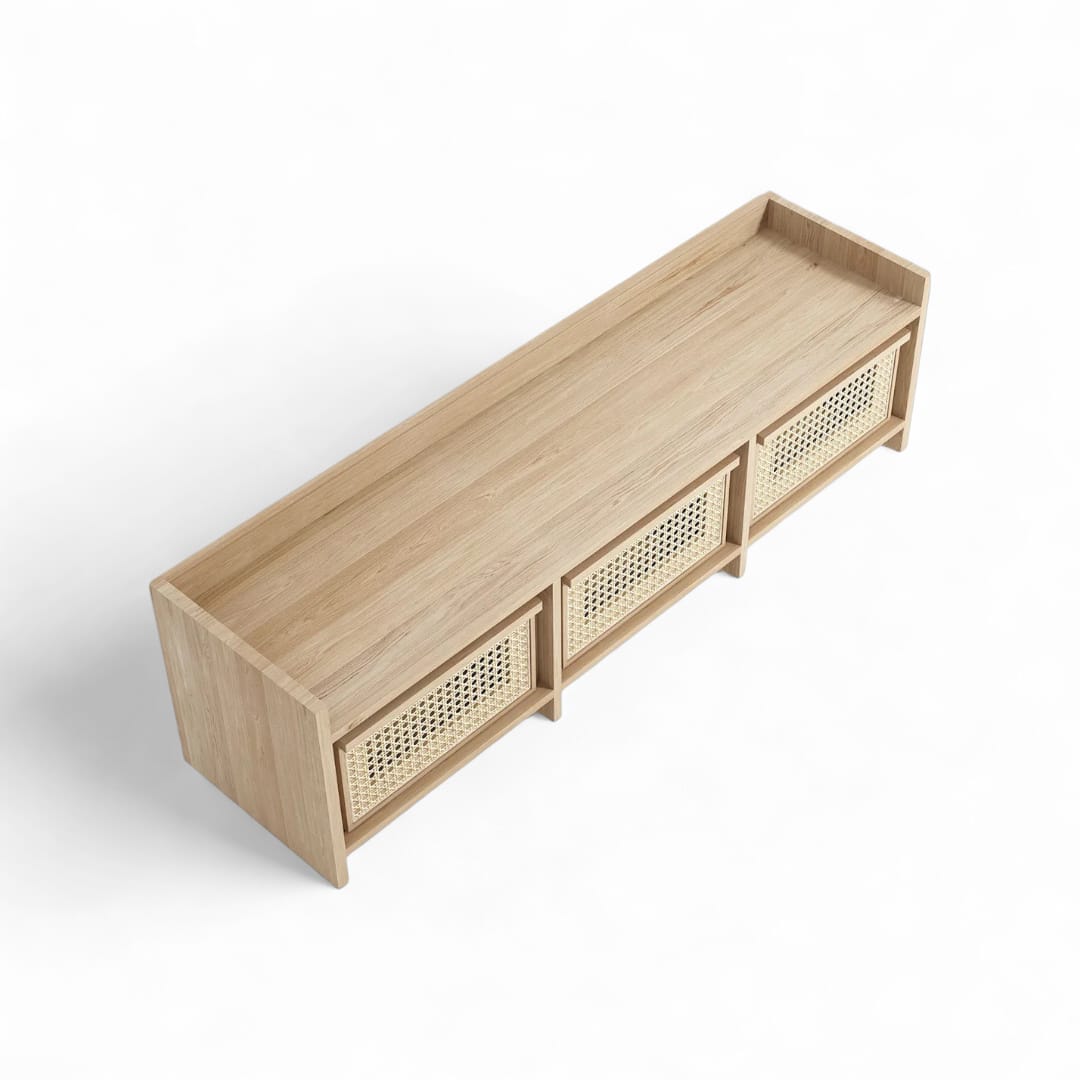 Tingkatkan tampilan ruang tamu Anda dengan meja TV kayu jati minimalis modern ini. Didesain dengan tiga laci penyimpanan yang stylish dan kombinasi rotan yang menambah sentuhan tekstural yang menarik. Meja ini memadukan keindahan kayu jati dengan elemen rotan, menciptakan keseimbangan antara fungsionalitas dan estetika modern. Sempurna untuk menambah karakter dan keteraturan di ruang tamu Anda.
