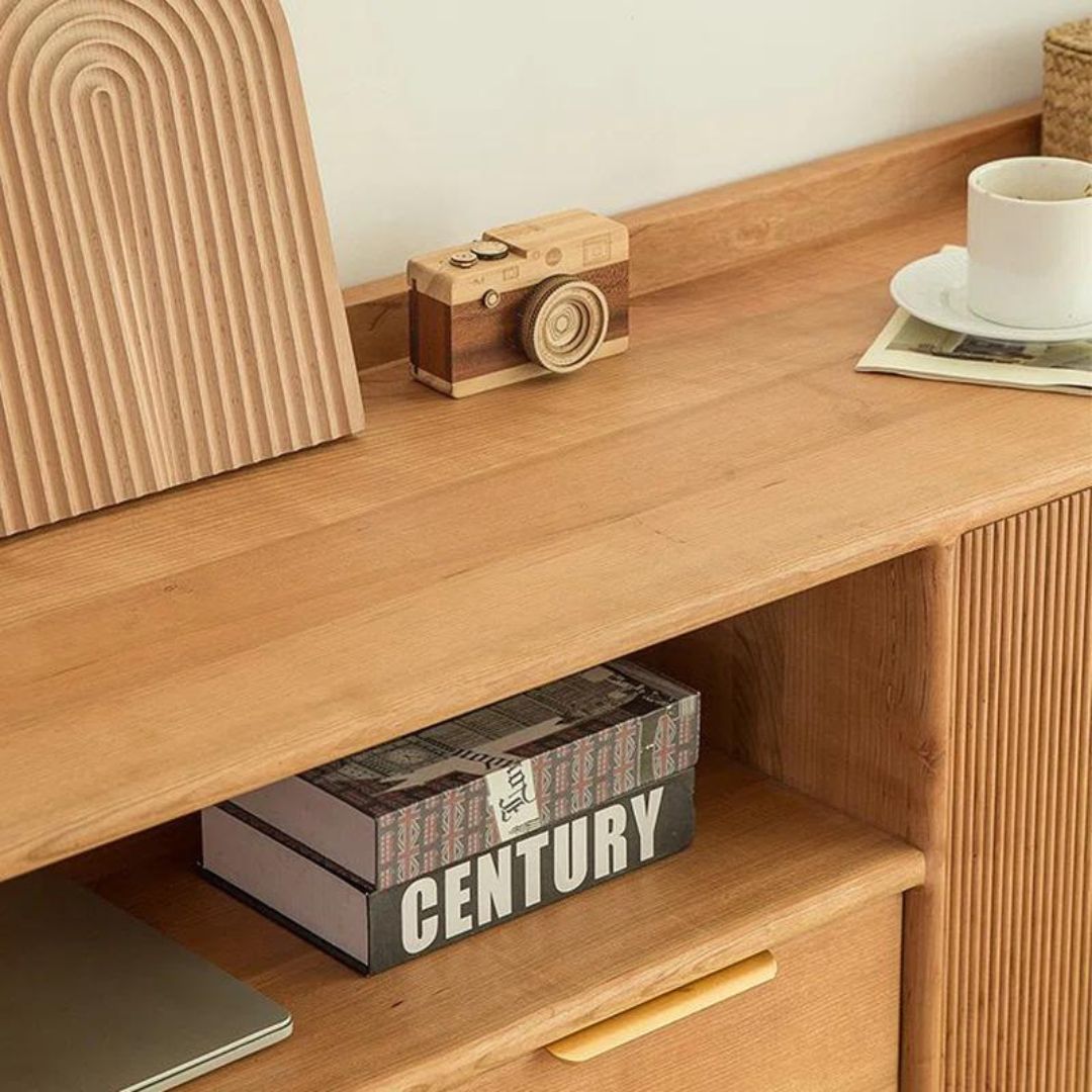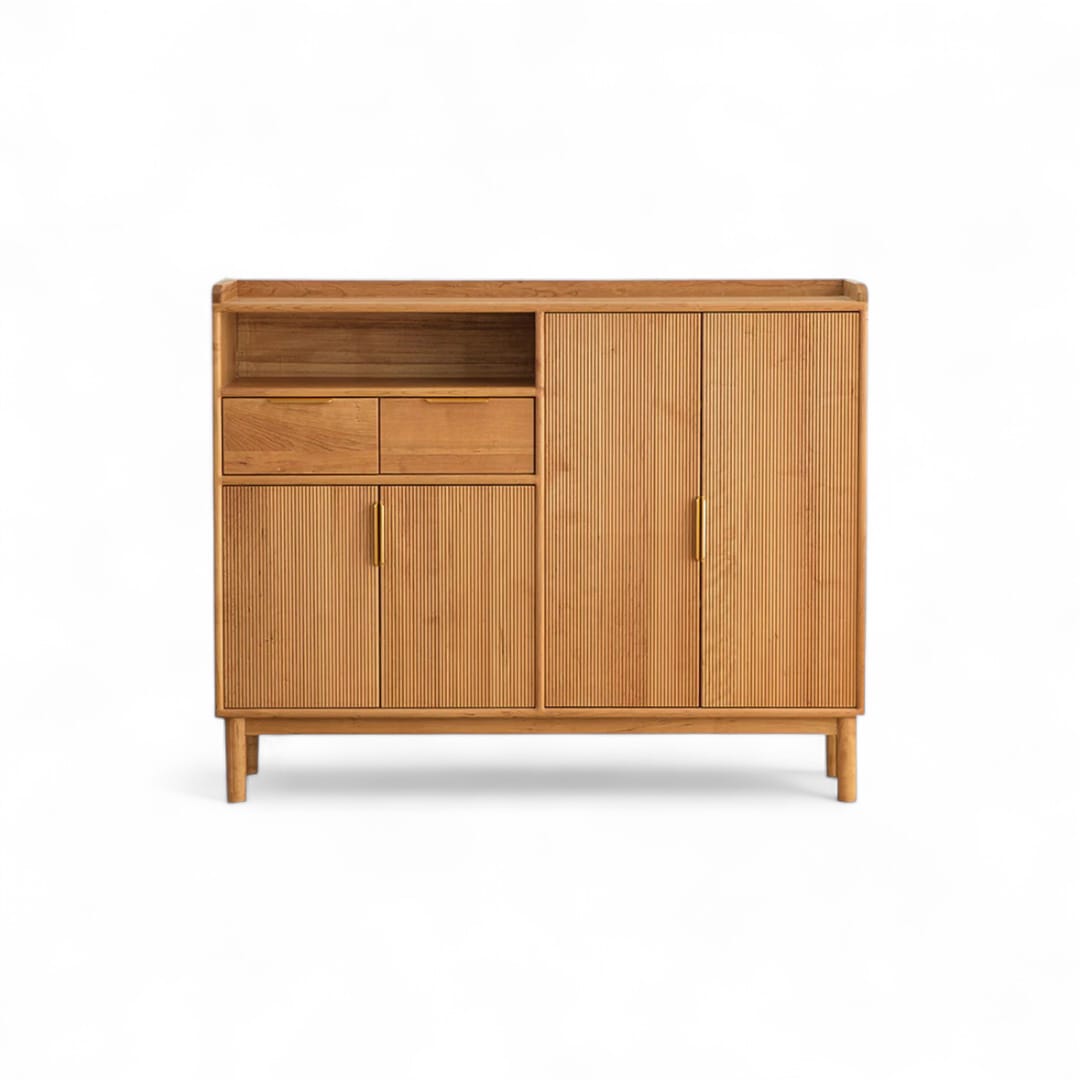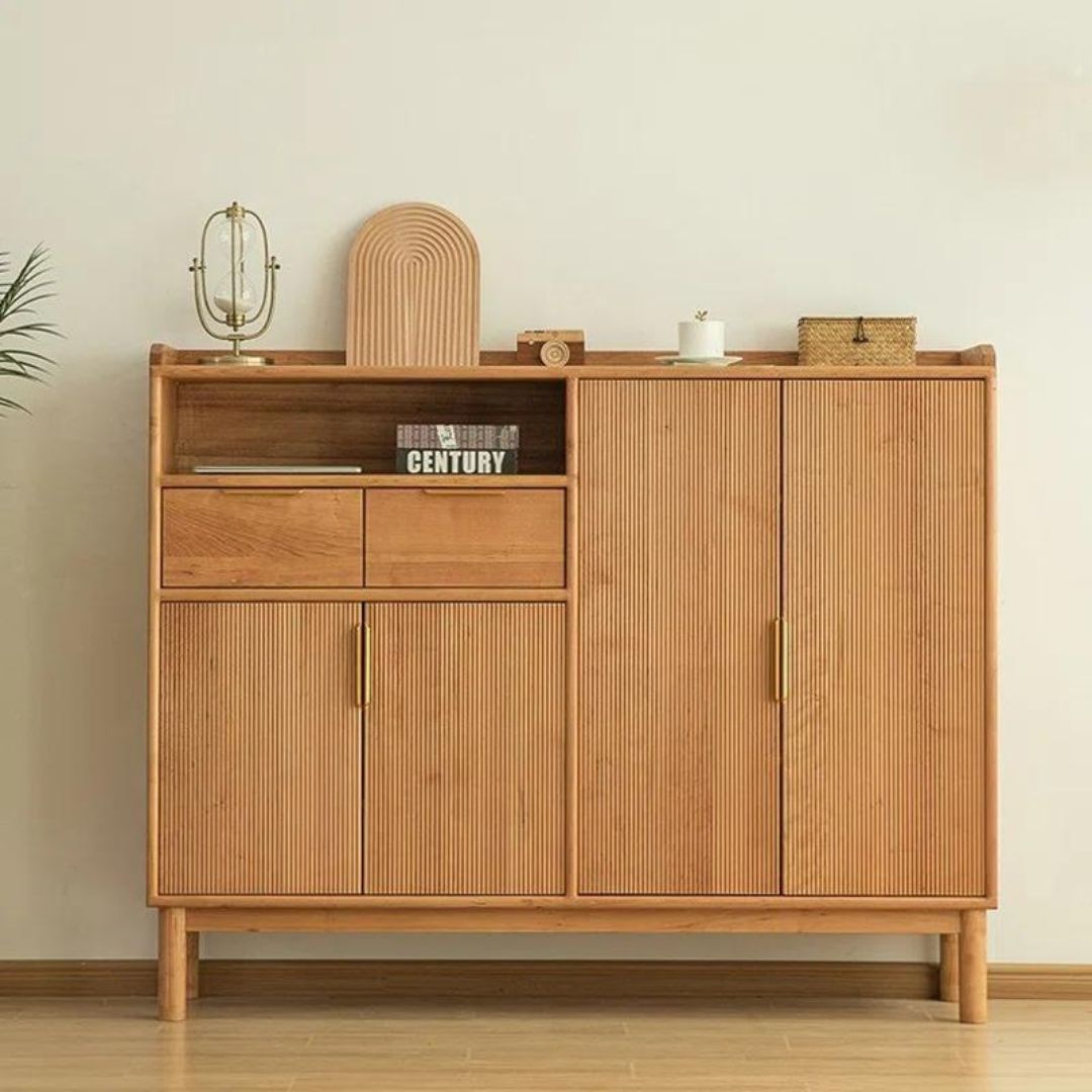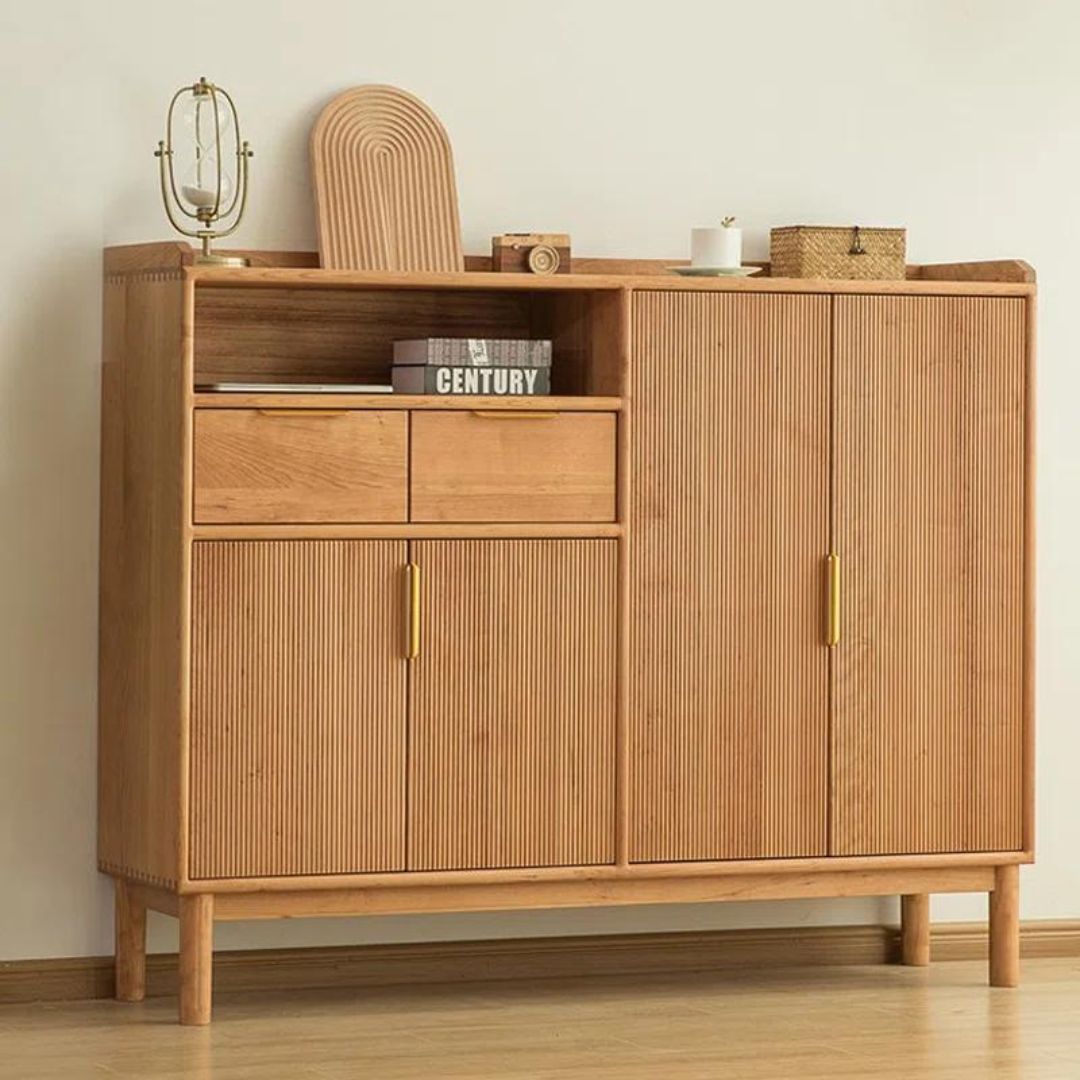 Rak sepatu kayu jati minimalis retro ini menghadirkan sentuhan klasik dengan motif garis-garis salur pada 2 pintu ruang penyimpanan utama. Dilengkapi 2 laci penyimpanan tambahan dan ruang penyimpanan terbuka di bagian atas, rak ini menawarkan kombinasi sempurna antara gaya dan fungsi. Desainnya yang unik menjadikan rak ini pilihan tepat untuk mengatur koleksi sepatu Anda dengan rapi dan elegan.
