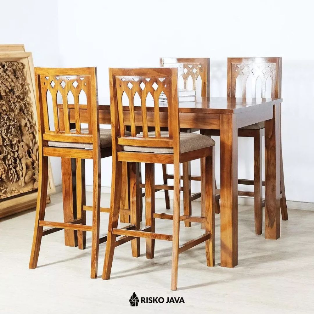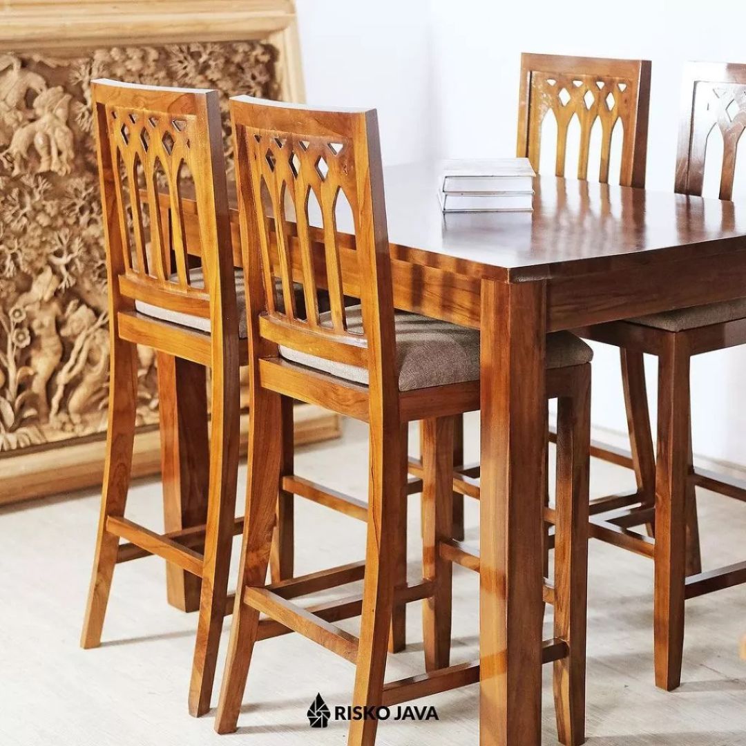 Ingin menghadirkan suasana hangat dan elegan di ruang makan atau area bar Anda? Set meja dan kursi bar ANGILERI dari Risko Java adalah pilihan tepat. Dibuat dari kayu jati perhutani pilihan, set ini memiliki keindahan alami yang menawan serta daya tahan yang luar biasa.